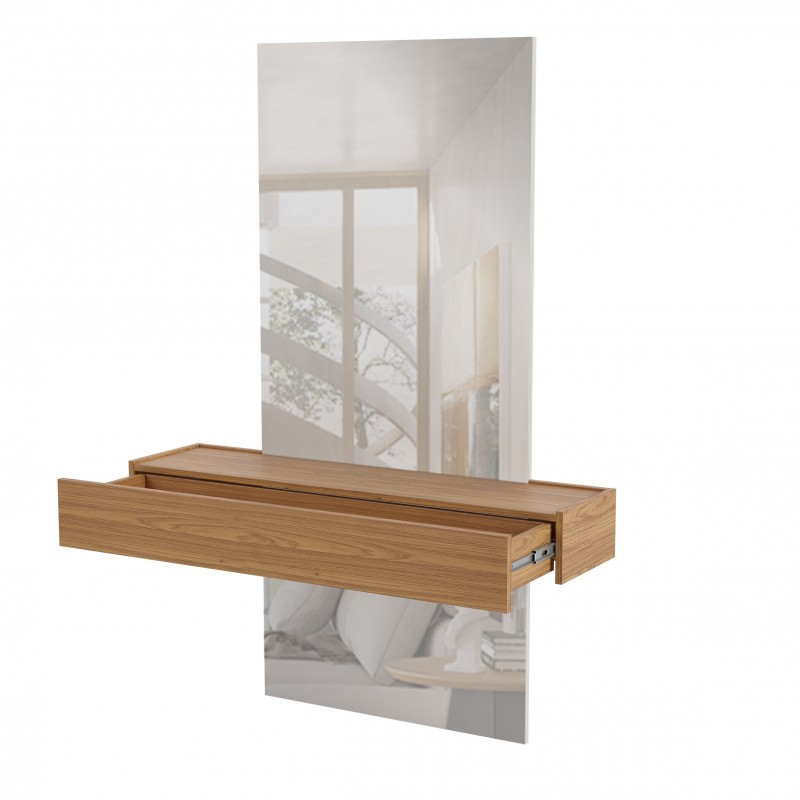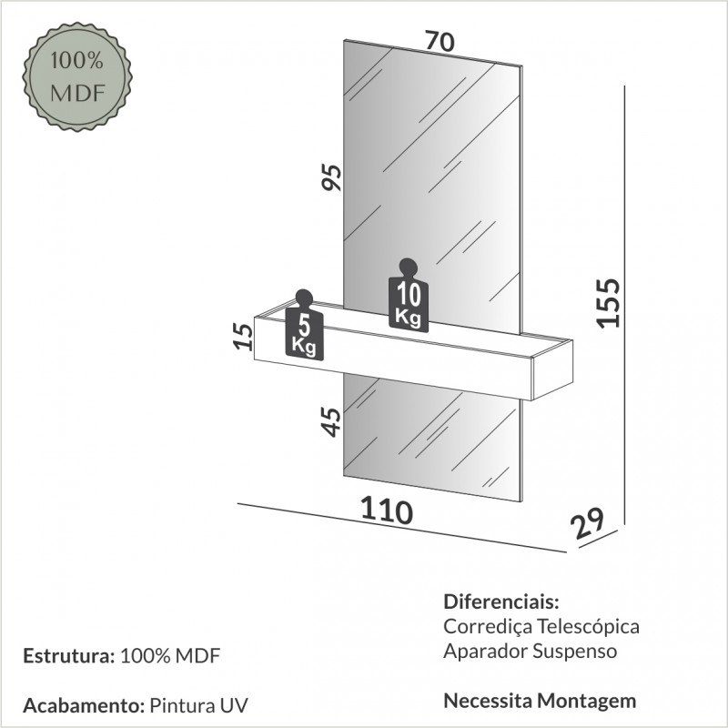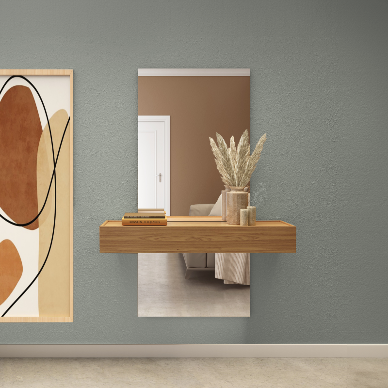 O espelho na parte traseira amplia o ambiente, proporcionando uma sensação de maior luminosidade e profundidade. A gaveta vem equipada com corrediças telescópicas que garantem um movimento suave e preciso. O tampo embutido, que cria um sutil degrau como puxador, complementa o design clean e moderno do móvel.
