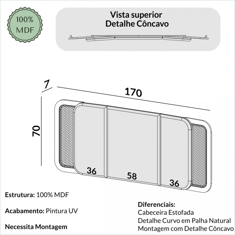 Produzida 100% em MDF de reflorestamento e com energia limpa de fontes renováveis, a Cabeceira Curve conta com corpo 100% MDF e detalhes em palha natural de algodão, transmitindo aconchego para qualquer ambiente. Pintura UV com 6 camadas de proteção e matérias primas de alta qualidade, fazem com que esse produto seja um acessório bonito e durável para a seu dormitório.