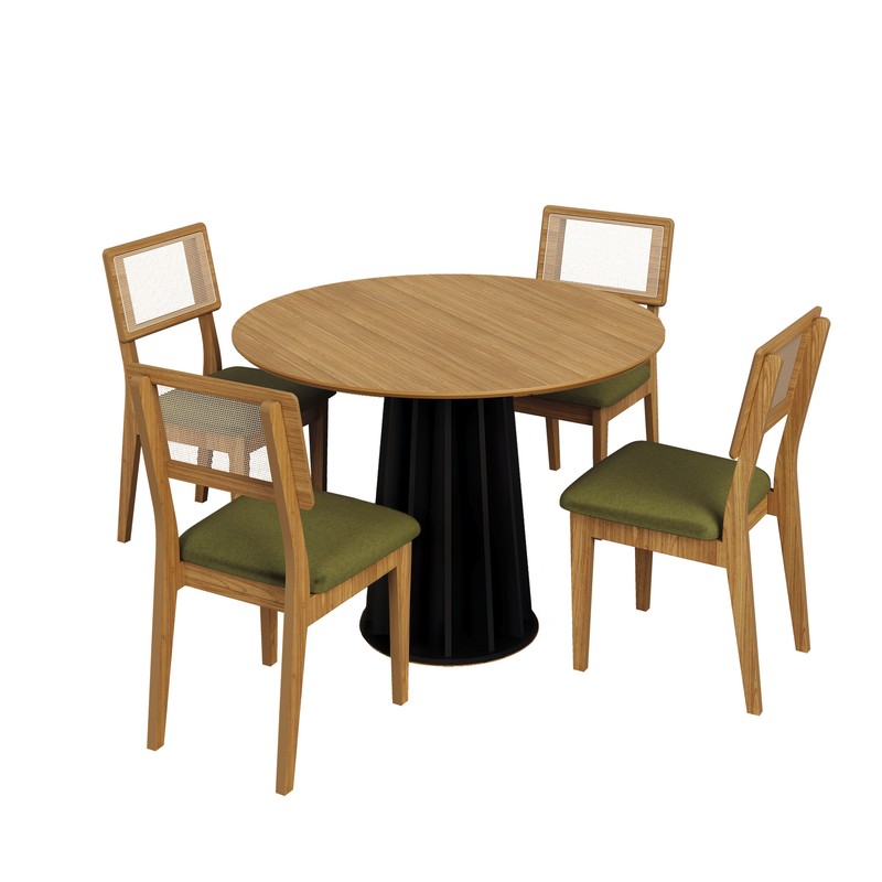 Acompanha 4 cadeiras com encosto em tela sintética, que garantem conforto, leveza visual e um toque contemporâneo ao seu espaço. Ideal para salas de jantar compactas ou ambientes integrados, esse conjunto une design funcional com charme atemporal.