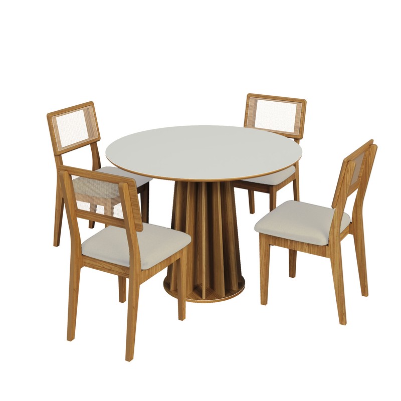 Acompanha 4 cadeiras com encosto em tela sintética, que garantem conforto, leveza visual e um toque contemporâneo ao seu espaço. Ideal para salas de jantar compactas ou ambientes integrados, esse conjunto une design funcional com charme atemporal.