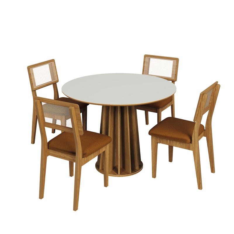 Acompanha 4 cadeiras com encosto em tela sintética, que garantem conforto, leveza visual e um toque contemporâneo ao seu espaço. Ideal para salas de jantar compactas ou ambientes integrados, esse conjunto une design funcional com charme atemporal.