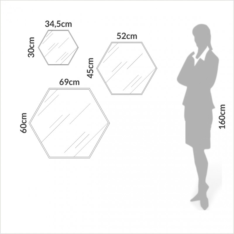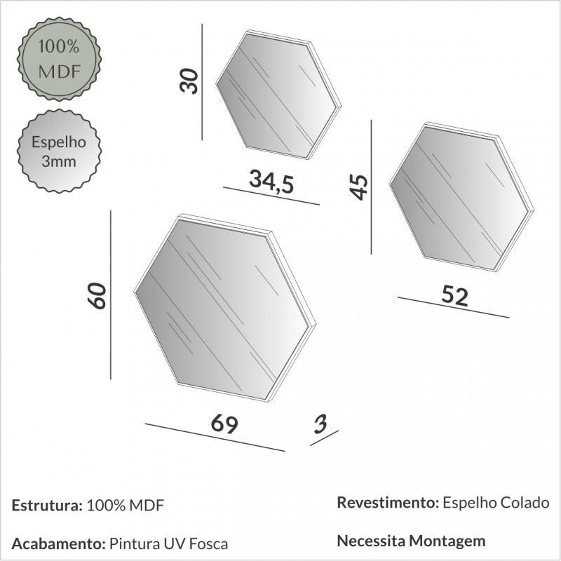 Todas as peças são produzidas 100% em MDF, com pintura de 6 camadas de proteção, o que lhes confere alta qualidade de acabamento. O conjunto ES13 possui 3 painéis decorativos em formato hexagonal e são peças chave para qualquer ambiente. Com proporções coringas, os espelhos são destaque para qualquer ambiente e conferem um design elegante para completar a decoração com exclusividade e personalidade.