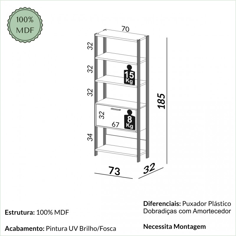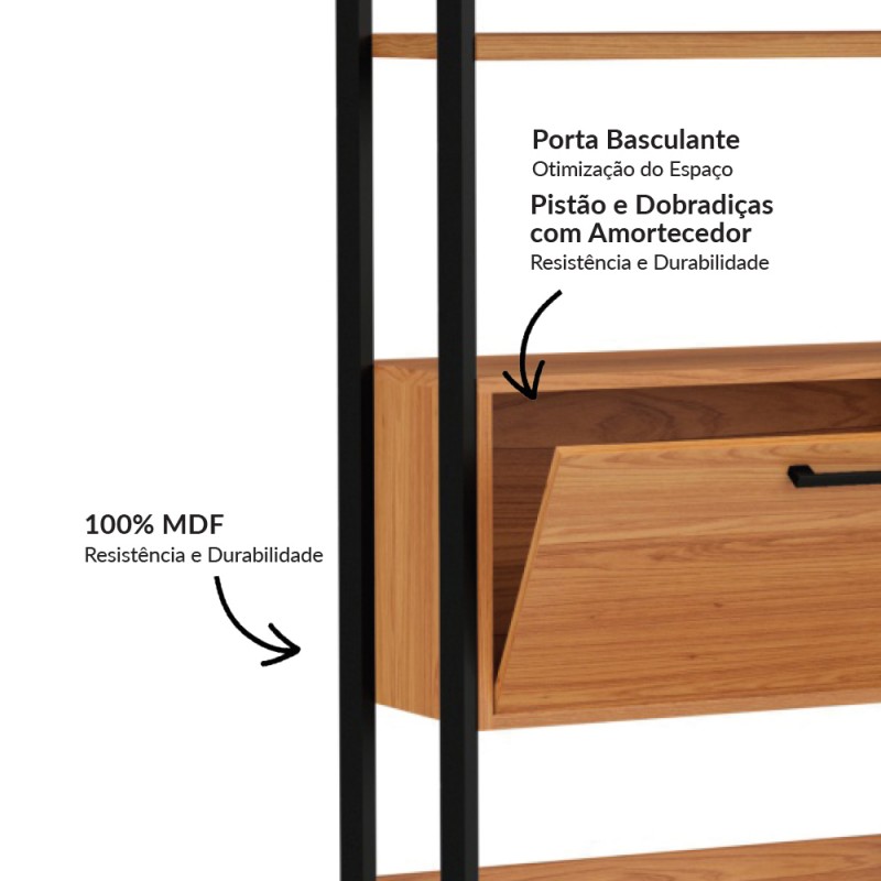 Esse produto 100% MDF possui 1 porta basculante com puxador plástico e dobradiças com amortecimento, que conferem uma maior resistência à peça. Espaçosa e versátil, essa estante tem design industrial feito com ripas 100% MDF, fixadas com ferragens de alta resistência. Com pintura de 6 camadas de proteção, a alta qualidade do acabamento faz com que esse produto da Dalla Costa se destaque em qualquer espaço.
