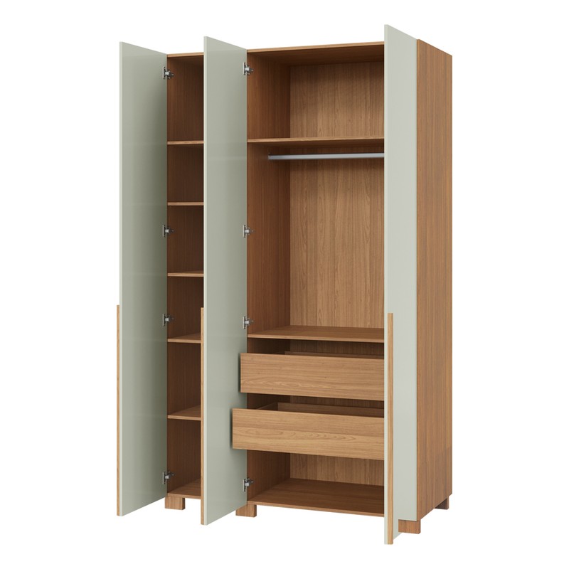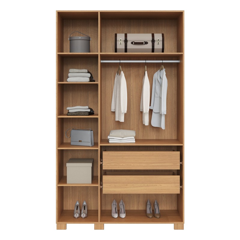 Seu interior foi projetado para garantir praticidade na organização do dia a dia. Com três portas de giro, o acesso aos compartimentos é facilitado, proporcionando um espaço interno bem distribuído. As duas gavetas internas são ideais para armazenar roupas menores e objetos pessoais, enquanto o cabideiro em alumínio permite acomodar peças mais delicadas de forma segura. Os puxadores e pés em MDF reforçam a estrutura do móvel, garantindo maior estabilidade e durabilidade ao longo do tempo.