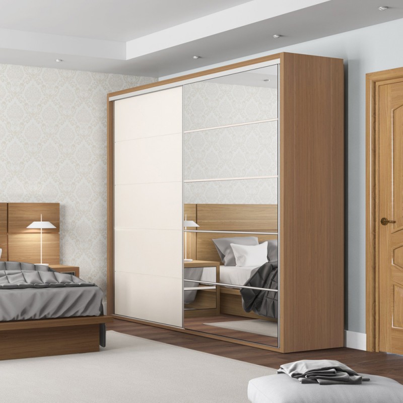 Guarda-Roupa 2 Portas de Correr 2 Gavetas 7 Prateleiras Espelhado Basic Freijó/Off White - Dalla Costa