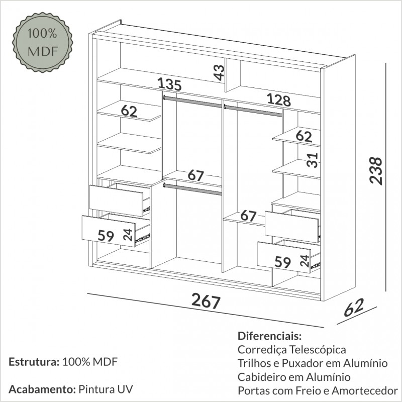 Com 2 portas de correr com corrediças telescópicas com freio e amortecedor, o TW303E entrega o que há de melhor para seu dormitório. Com trilhos, puxadores, cabideiros em alumínio, e um espaço interno planejado com repartimentos bem distribuídos e 4 gaveteiros, este produto é perfeito para manter suas roupas e acessórios sempre organizados.