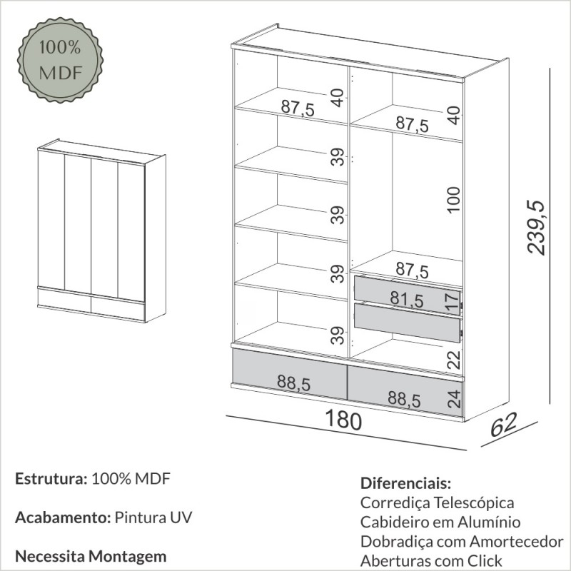 O guarda roupas é lindo! Extremamente espaçoso Material de ótima qualidade Recomendo!!!