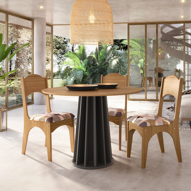 Ela acomoda até 4 lugares e é a combinação de um design moderno com delicadeza e qualidade. Sua estrutura 100% MDF garante a mais alta qualidade de acabamento para o produto. O design minimalista que dá a impressão de ripados sustentando um tampo robusto é construído a partir de ferragens com alta capacidade de sustentação. A base dos pés possui apliques de plástico na parte inferior, para aumentar a durabilidade da peça, mesmo com limpezas frequentes. As ripas dos pés dispostas em formato cônico e o tampo arredondado transmitem fluidez e são interessantes para lares com crianças agitadas. A alta qualidade do acabamento faz com que esse produto da Dalla Costa se destaque em qualquer espaço.