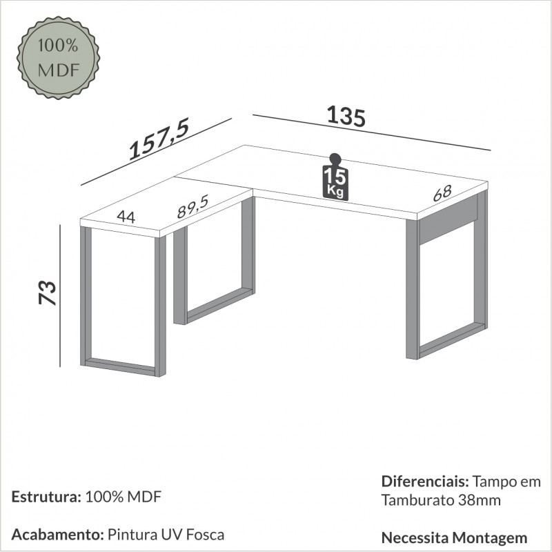 Esse produto 100% MDF possui design industrial em L, ideal para cantos, com ripas fixadas com ferragens de alta resistência. Com pintura de 6 camadas de proteção, a alta qualidade do acabamento faz com que esse móvel se destaque em qualquer espaço. Esse modelo possui em amplo tampo em tamburato, o que confere maior resistência e menor peso à peça.