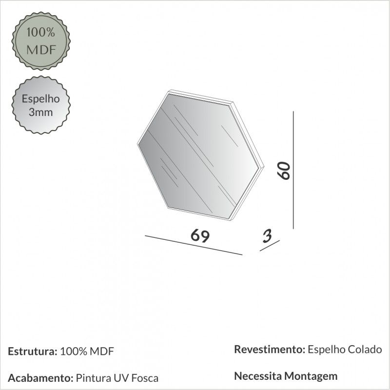 Todas as peças são produzidas 100% em MDF, com pintura de 6 camadas de proteção, o que lhes confere alta qualidade de acabamento. O conjunto ES13 possui 3 painéis decorativos em formato hexagonal e são peças chave para qualquer ambiente. Com proporções coringas, os espelhos são destaque para qualquer ambiente e conferem um design elegante para completar a decoração com exclusividade e personalidade.