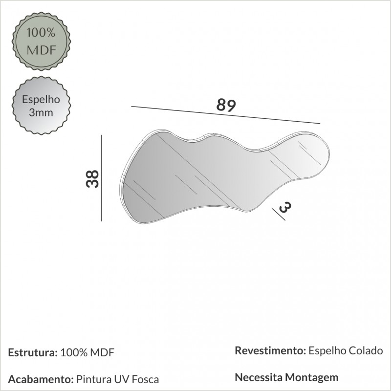A peça é produzida 100% em MDF, com pintura de 6 camadas de proteção, o que confere alta qualidade de acabamento. O ES19 possui formato orgânico e é uma peça chave para qualquer ambiente. Com proporções generosas, este espelho confere um design elegante para completar a decoração da sua casa com personalidade.