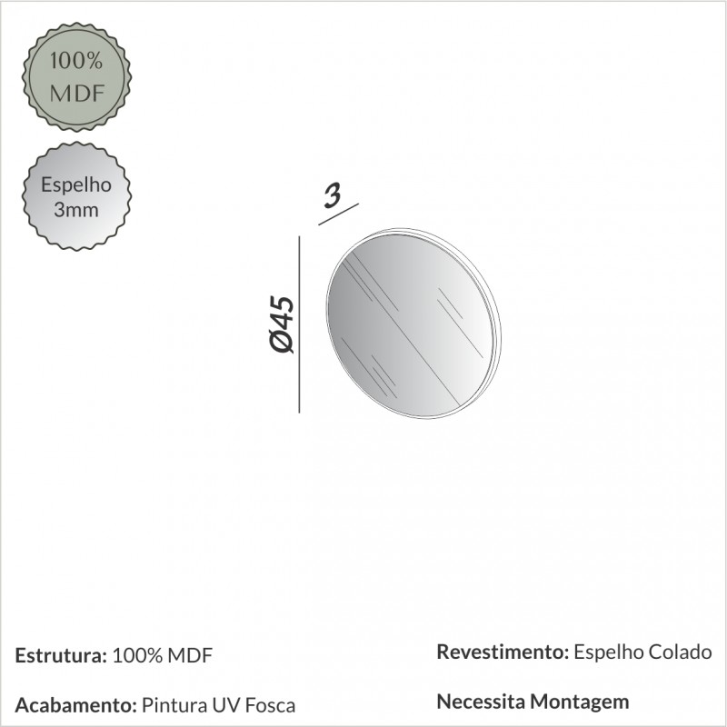 A peça é produzida 100% em MDF, com pintura de 6 camadas de proteção, o que confere alta qualidade de acabamento. O ES10 possui forma arredondada e é uma peça chave para qualquer ambiente. Com proporções coringas, o espelho é destaque para qualquer ambiente e confere um design elegante para completar a decoração com exclusividade e personalidade.