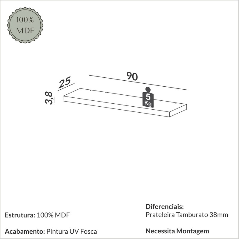 Prateleira 90cm Basic Preto Fosco - Dalla Costa