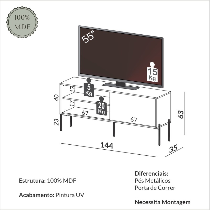O Rack Florença de 144cm é a combinação perfeita de sofisticação e funcionalidade para sua sala de estar. Com um design elegante, ele conta com uma porta de correr prática, que proporciona mais espaço e organização. O corpo do móvel é em pintura UV freijó, com tonalidade quente e acolhedora, enquanto a porta de correr em off white traz um contraste suave e moderno. Os pés metálicos dourados completam o visual, conferindo um toque de luxo e requinte ao ambiente. Ideal para quem busca um móvel versátil e de alto estilo, o Rack Florença é a escolha perfeita para complementar a decoração com charme e praticidade.